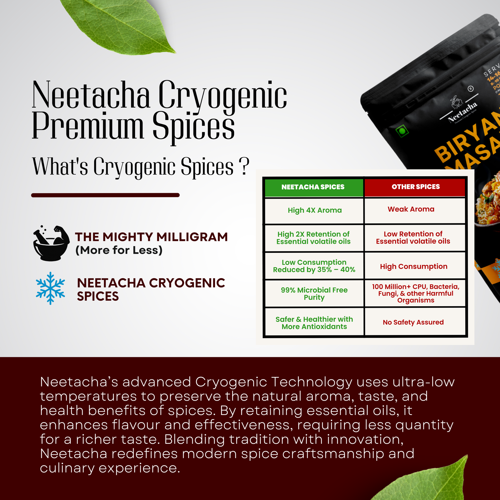 - Neetacha’s cryogenic technology preserves the original taste, deep aroma, and even the digestive benefits of every spice.