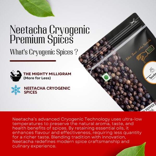 NEETACHA Premium Cryogenic Black Pepper Powder is made from carefully selected black peppercorns that are processed using cryogenic grinding technology to preserve their natural aroma, flavour, and pungency.