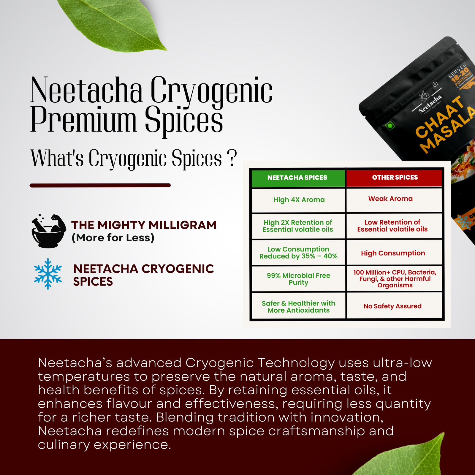 - Neetacha’s cryogenic technology preserves the natural tang, bold taste, and wellness benefits of every spice and salt.