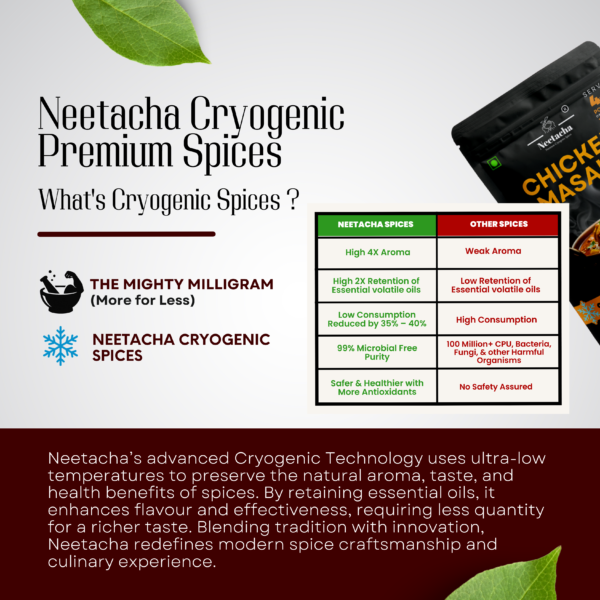 • Neetacha’s cryogenic technology preserves the original taste, vibrant aroma, and even the therapeutic qualities of every spice.