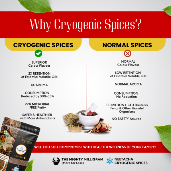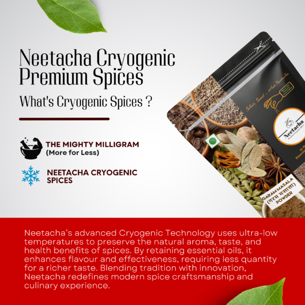 NEETACHA spice powders are processed using advanced cryogenic grinding, which preserves the natural aroma, flavour, and essential oils of the spices for a richer and fresher taste.