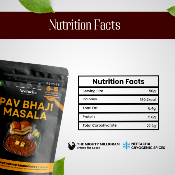 | Common name | Neetacha Premium Cryogenic Pav Bhaji Masala | 50 g | Fresh & Natural, Aromatic, Flavourful for Daily Cooking Needs |