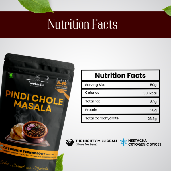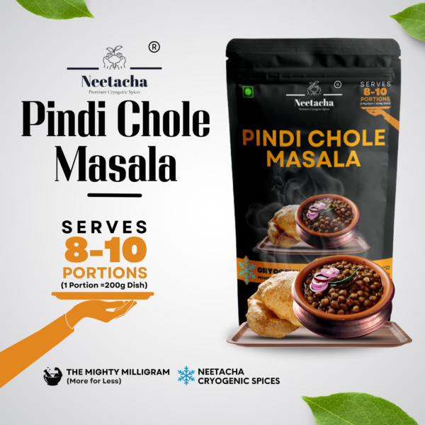 NEETACHA Premium Cryogenic Pindi Chole Masala is a specially crafted blend of high-quality spices processed using cryogenic grinding technology to preserve the natural aroma, colour, and flavour of the spices, giving authentic Punjabi-style Pindi Chole taste.