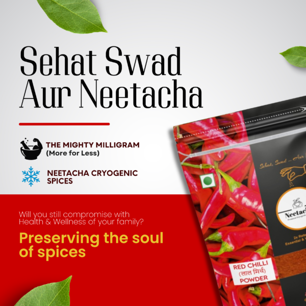 NEETACHA Premium Cryogenic Red Chilli Powder is made from carefully selected red chillies that are processed using cryogenic grinding technology to preserve their natural colour, flavour, and pungency.